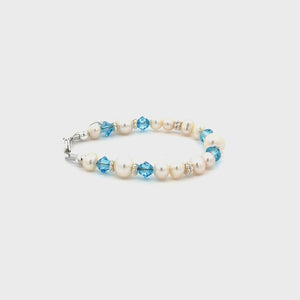 Sterling Silver birthstone bracelet featuring beautiful soft white high-end Austrian simulated pearls and sparkling high-end crystals. This is a beautiful way to celebrate the birth of a new baby or wonderful birthday gifts too! Bracelet comes in a beautiful black/pink gift box.