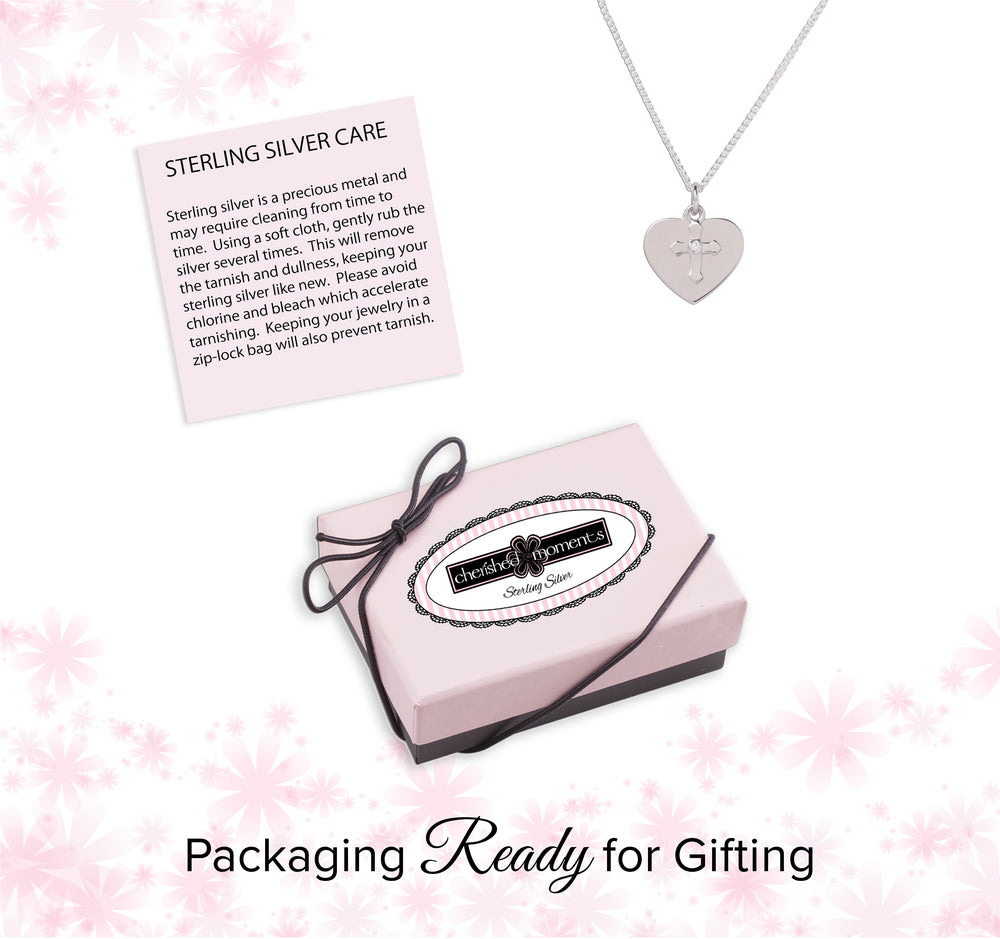Classic girls sterling silver heart necklace with floating cross charm that can be engraved with her name or special sentiment. Heart measures 15mm and floats on a 14" or 16-18" (adjustable) Italian chain with high-quality durable lobster clasp. This is rhodium plated to prevent tarnish for everlasting quality. A look she will love and be a keepsake she will cherish forever! What a special keepsake gift for baptism, first communion and confirmation! Necklace comes in beautiful gift box.