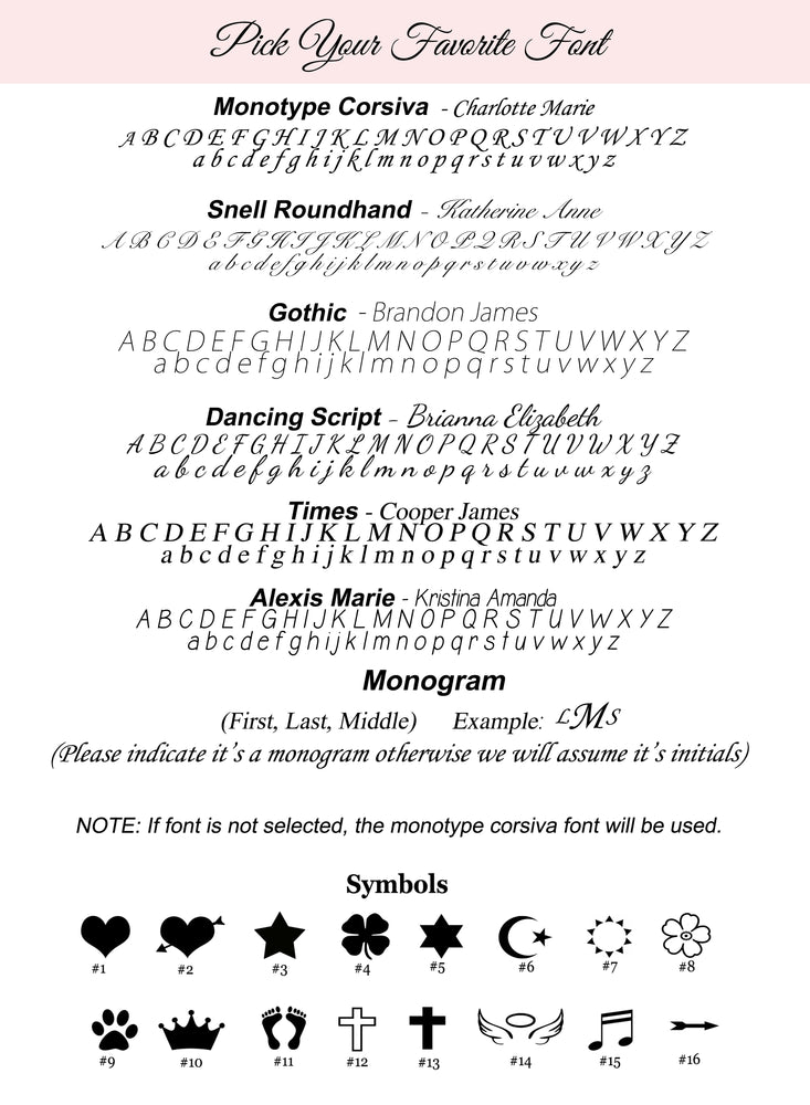 Make it extra special by adding engraving so it's unique just for her (up to 9 characters). See image for font and symbol choices.
