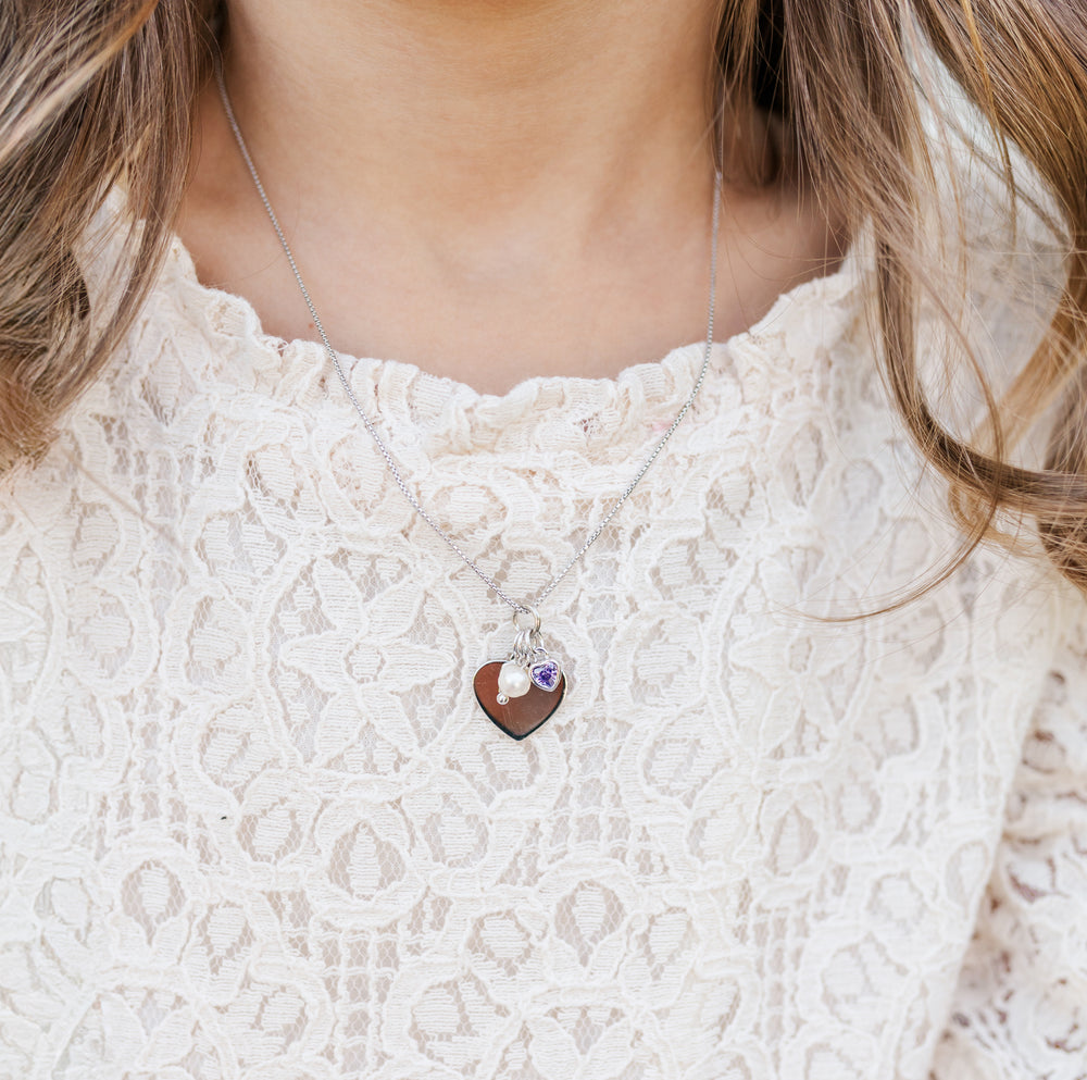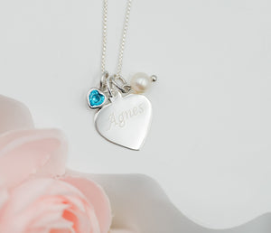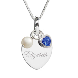 Personalized birthstone necklace and includes heart pendant that includes FREE engraving with her name or special sentiment, accented with a CZ heart representing the birthstone, and a freshwater pearl charm.