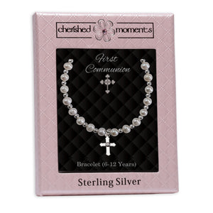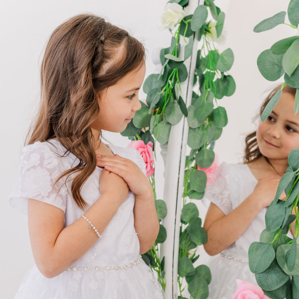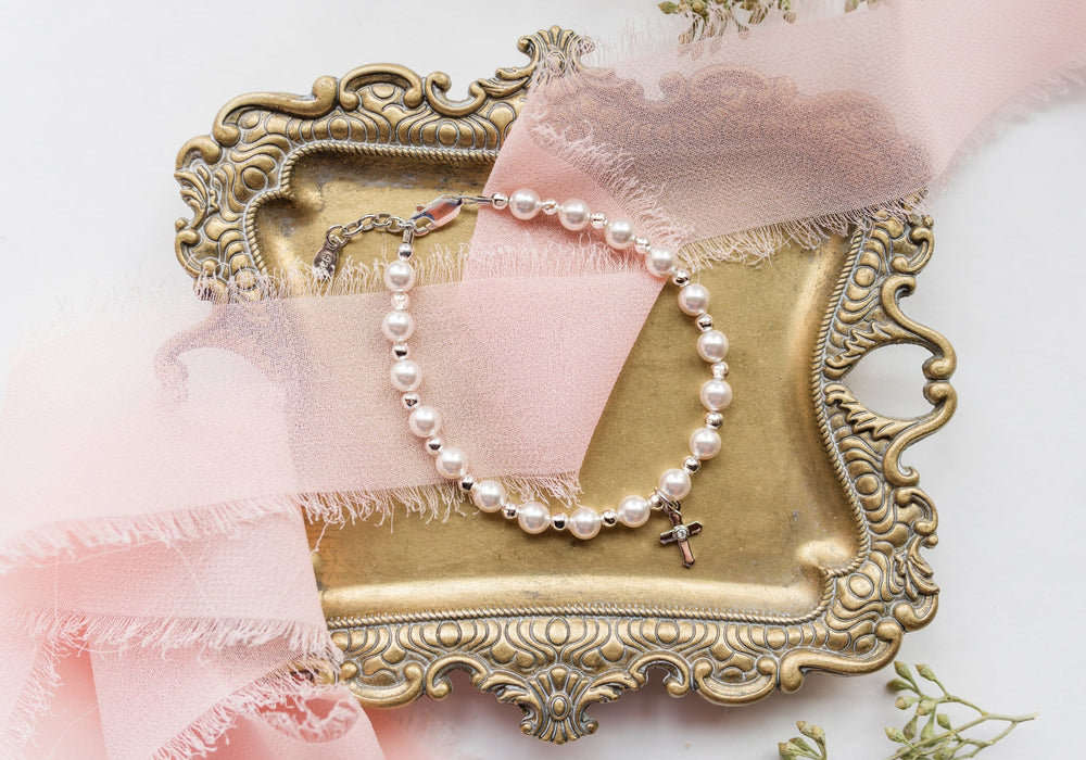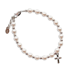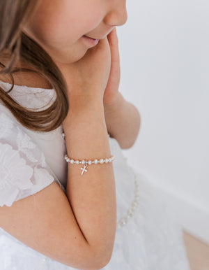 Special first communion bracelet featuring high-end Austrian simulated pearls and accented with a unique silver cross in the center. This precious bracelet for girls is perfect for first communion. Each bracelet measures 6 inches + .5 inch extension chain so it's adjustable for a perfect fit and comes in a beautiful gift box. A keepsake she will cherish Forever. This jewelry is hand-made in the USA.
