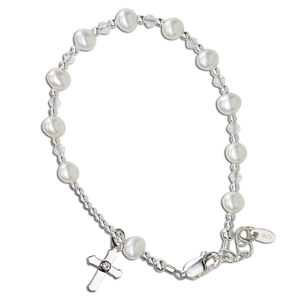 Special first communion rosary bracelet featuring freshwater pearls, high-end crystals and accented with a unique silver cross in the center. This precious bracelet for girls is perfect for first communion and is presented with a sweet little poem for her First Communion. The bracelet measures 6 inches + .5 inch extension so it can be adjusted for a perfect fit. This jewelry is hand-made in the USA.