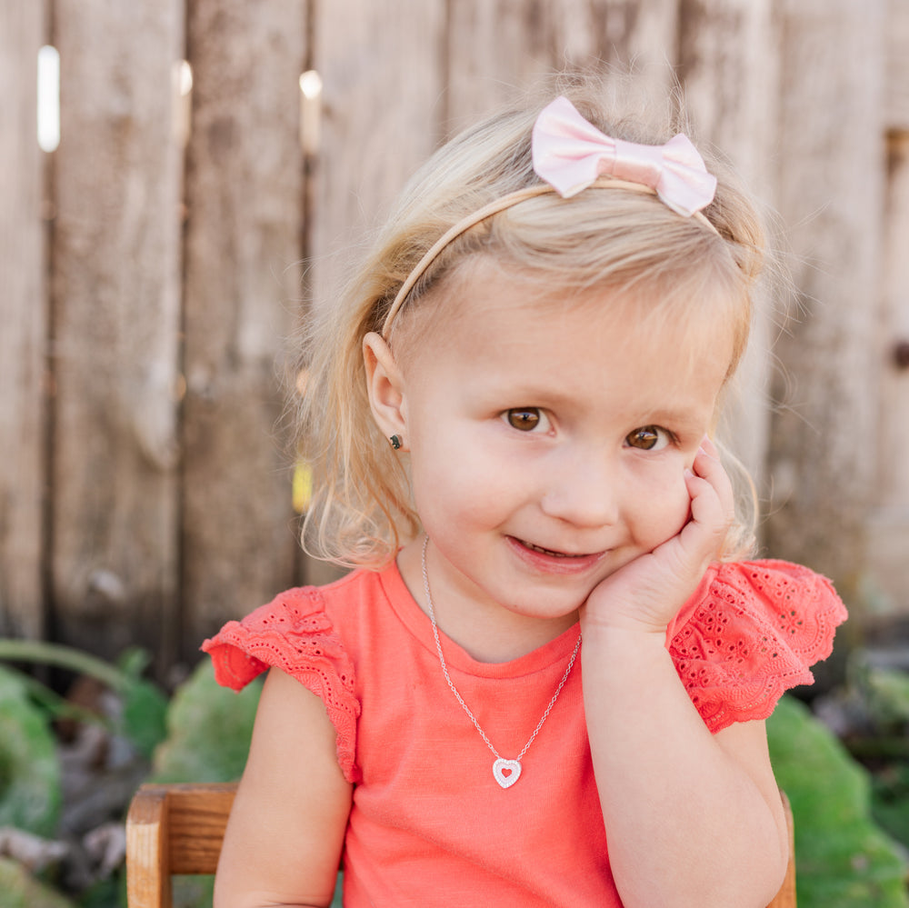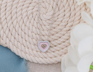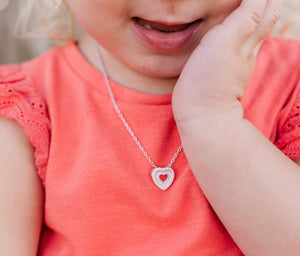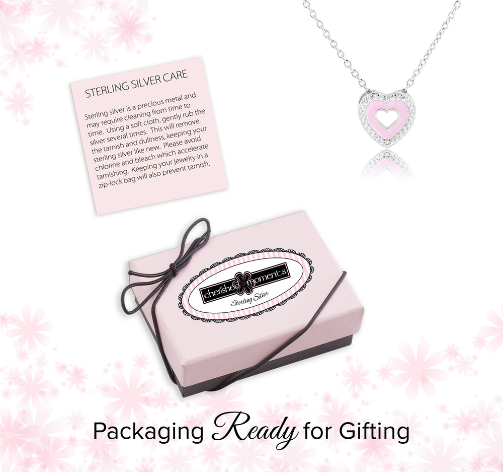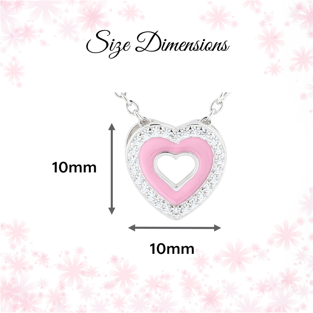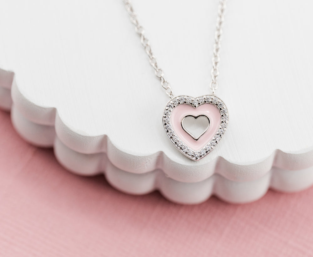 Girls beautiful .925 Sterling Silver Heart Necklace with Soft Pink Enamel Heart accented with sparkling CZ stones. Carefully crafted with the utmost attention to detail, this charming pendant will bring sparkle to every day as it reminds her of how much she is loved. This meaningful charm makes a very special gift she will treasure forever!