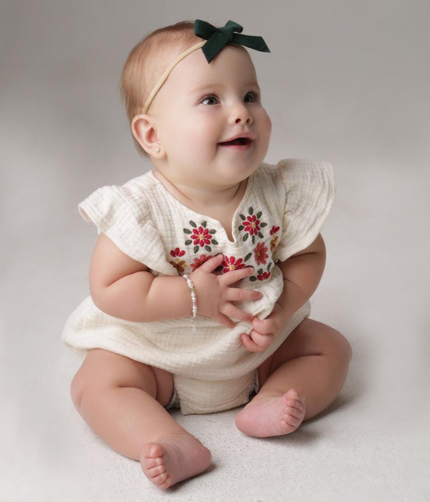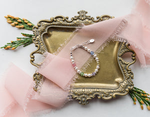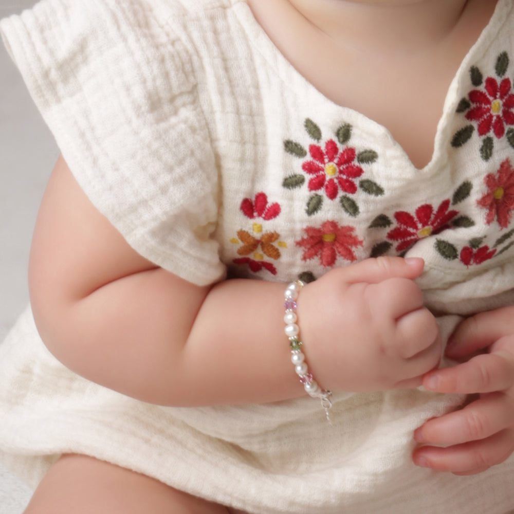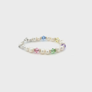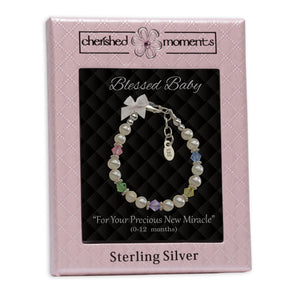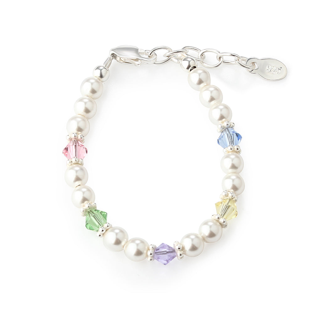 This precious little bracelet is made of sterling silver, beautiful high-end Austrian simulated pearls, and pastel high-end crystals. A wonderful baby shower gift with a special sentiment and gift box for their sweet little new arrival. Celebrate these cherished moments with this keepsake she will treasure forever (0-12 months adjustable). Bracelet measures 4 - 4.5 inches