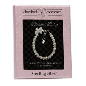 This precious little bracelet is made of sterling silver and beautiful high-end Austrian simulated pearls with sparkling silver accents. A wonderful baby shower gift with a special sentiment in a beautiful gift box for their sweet new arrival. Celebrate these cherished moments with this keepsake she will treasure forever (0-12 months adjustable). Bracelet measures 4 - 4.5 inches