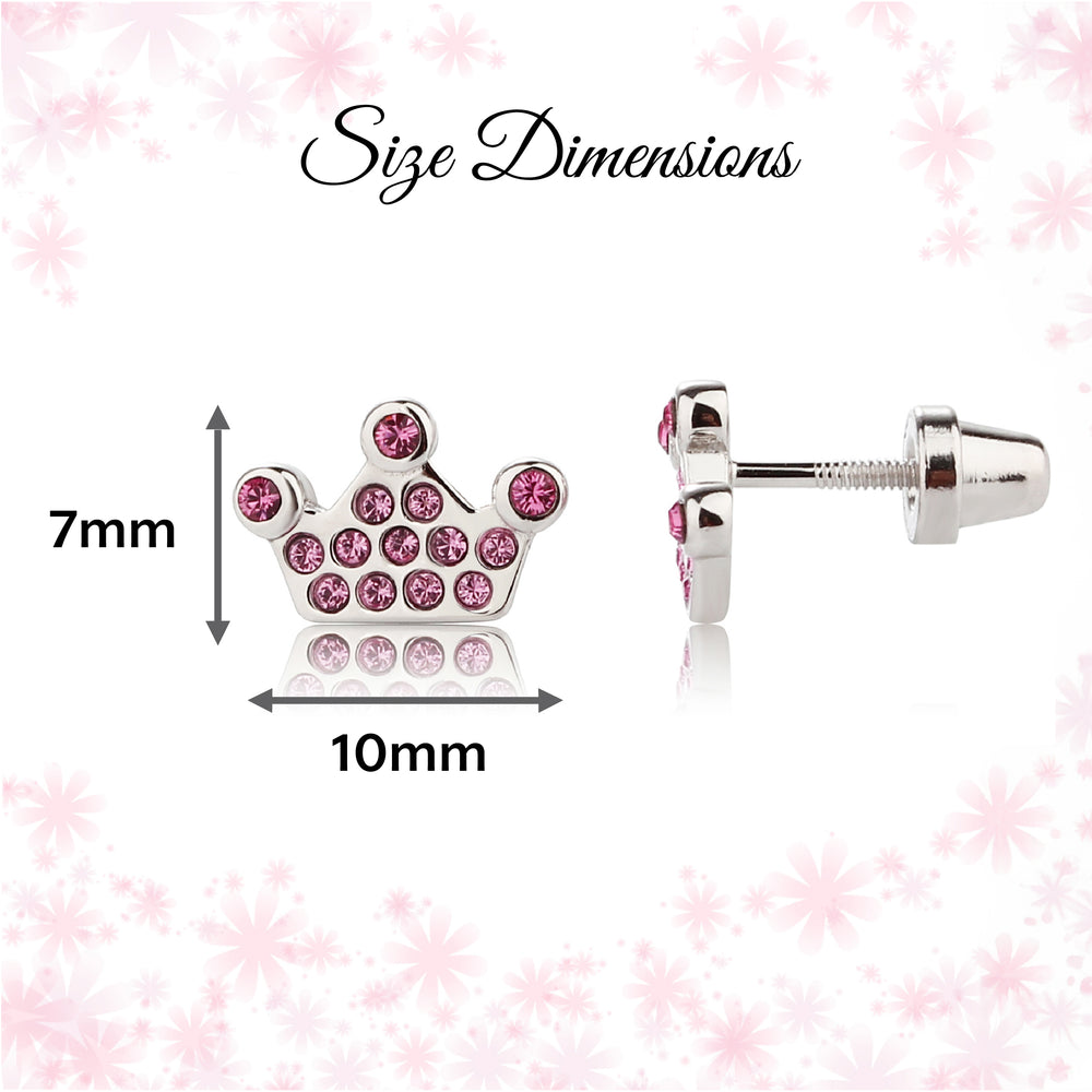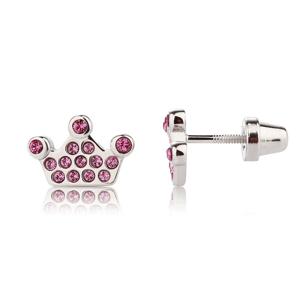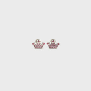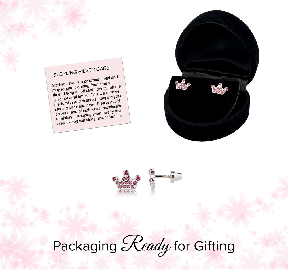 Sterling silver pink princess tiara pave earrings accented with sparking pink CZs. These earring have screw back closure so they are secure and protect the back of her little ears. Perfect gift for those girls who love to be a princess! Earrings comes in beautiful black velvet heart gift box.Earrings include an extra hypo-allergenic, anti-tarnish finish to keep your pieces sparkling beautifully for years to come. A keepsake she will treasure forever!