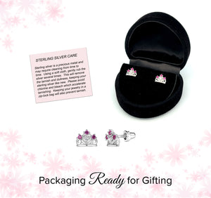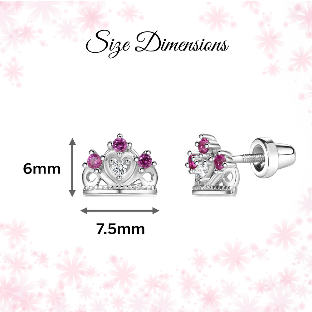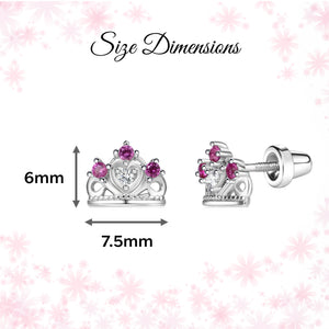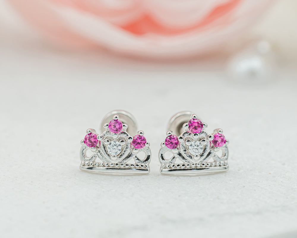 Popular sterling silver princess tiara earrings accented with sparking pink CZs and screw back closure so they stay put and won't fall off. Perfect gift for those girls who love to be a princess! Earrings comes in beautiful black velvet heart gift box. Matching bracelet, charm necklace, and rings are also available.Earrings include an extra hypo-allergenic, anti-tarnish finish to keep your pieces sparkling beautifully for years to come.