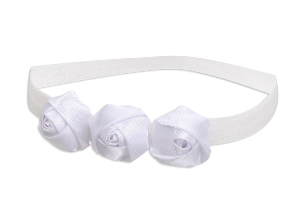 From our "Petals" collection this precious white baby headband is adorned with three dainty satin rosettes.  This makes the perfect accessory for her christening, baptism, dedication or blessing day.  A keepsake she will treasure forever! one size fits all.